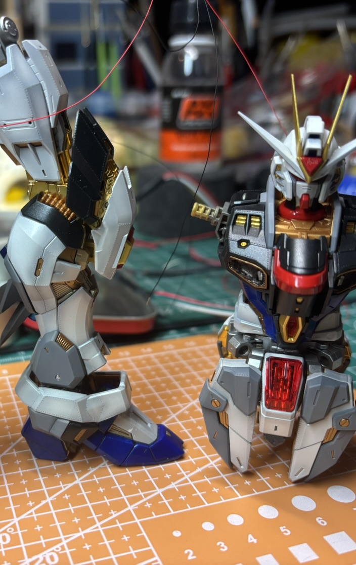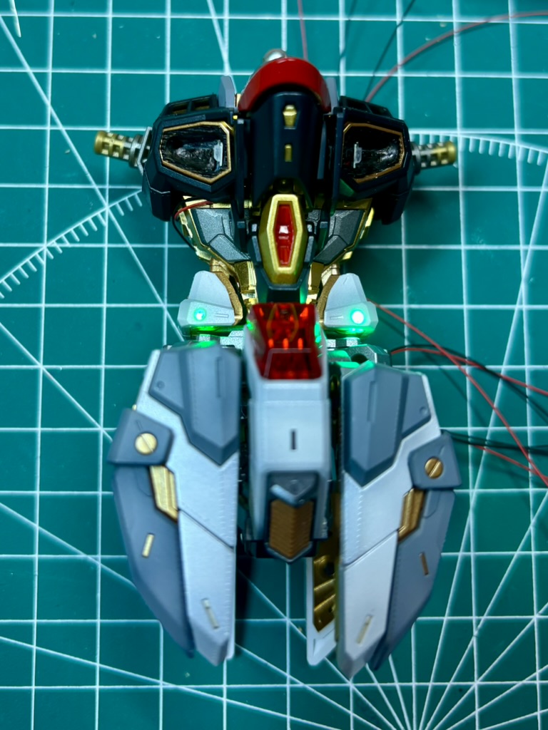 Last two LEDs were installed in Gundam’s body. All torso cables were connected together and mounted at back. I decided to use magnetic connector for Gundam LEDs. Instalation place was quite obvious 😉 I removed one of the grills from the back of the model and fit the connector in. It was exhausting… One arm…