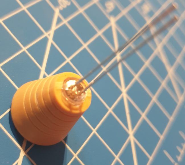 The project is getting more and more complicated… I was thinking over night about adding some light to the model…I tried with one 5mm LED and drilled in one of the thrusters – damn… now I need to drill all 12…. Don’t have any idea how to and where I will hide cabling and etc.…