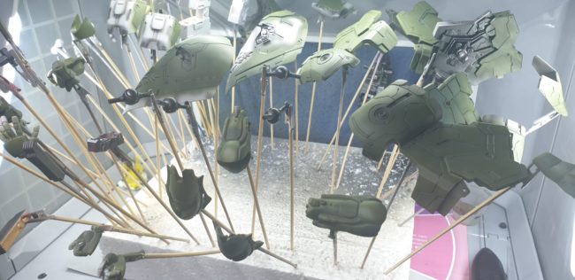 All parts were cleared with warm water mixed with dishwasher, then I left it for overnight drying. As you can see – there are no binders/wings parts. I decided to split project in half and start with painting mobile suit without wings first. Sooo many clamps! Ready for primer. Gray MR Surfacer 15000 applied –…