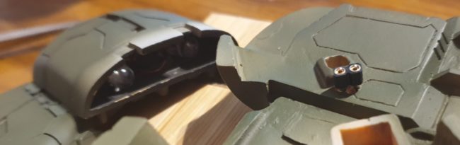 MonoEye, mega particle cannons was quite easy to drill in.Other parts requires more attention and a lot of patience to cut through fragile resin… I did my best – it went how it went…I removed a lot of resin from inside to fit the cabling – general idea is to connect everything within hollow body…