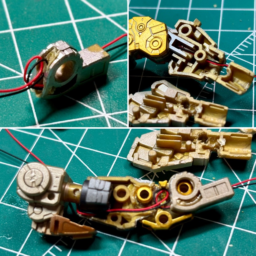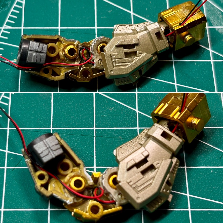 There is one red LED on the forearms, cabling need to be hidden inside the joint. After some time I found a way to keep articulation on and to not destroy the wiring. The idea is to add a loop for the cabling that would extend within join without providing much wear to the cable.